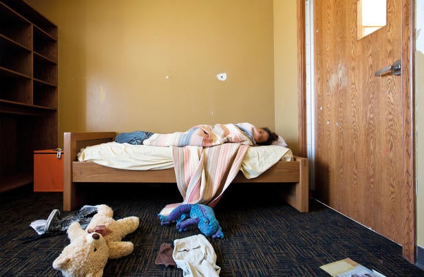 Teenager lies under the covers at Starview Adolescent Center. The center consists of two facilities: a CTF (community treatment facility) and PHF (psychiatric health facilty).