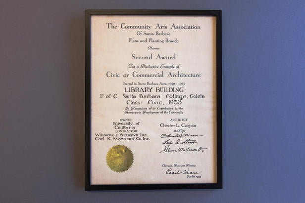 The Library was the first building designed and completed for the University of California on this site (a former WWII Marine air base). In 1954, the Santa Barbara College of the University of California officially moved from its Mesa and Riviera campuses to the new location.