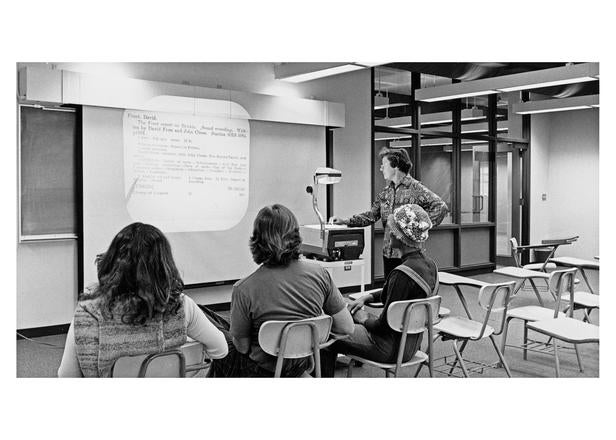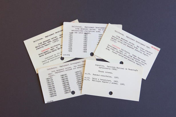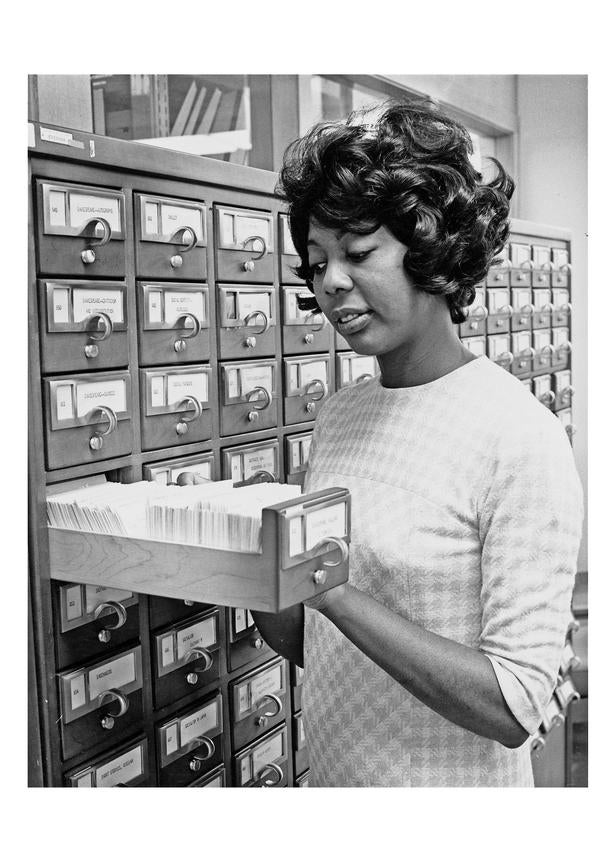 Black Studies Librarian Rubye Ballard at the card catalog1971
