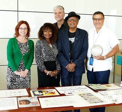 (From left to right: Danelle Moon, Director, UCSB Library Special Research Collections; Anna Everett, Professor, Film & Media Studies; Graham Barnard, a friend of Floyd; Floyd Norman; Sal Güereña, Director, California Ethnic and Multicultural Archives, UCSB Library Special Research Collections)