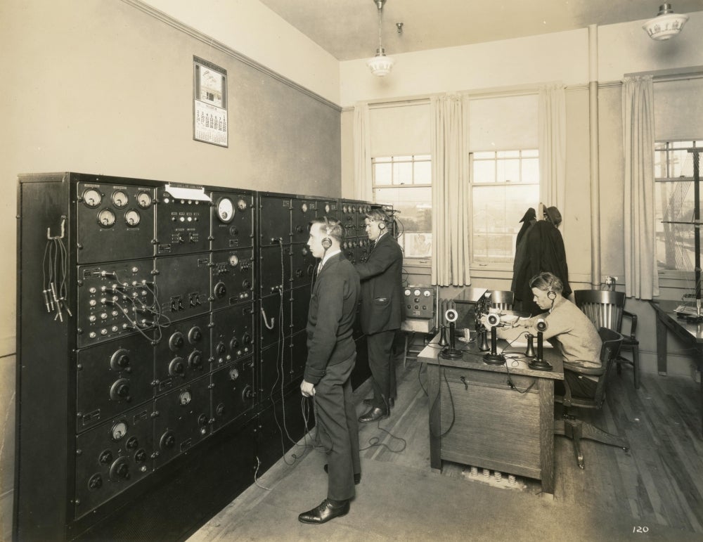 Photo credit: The control room of broadcasting station KGO. From the KGO collection in the Pacific Pioneer Broadcasters Collection, circa 1923-1924.