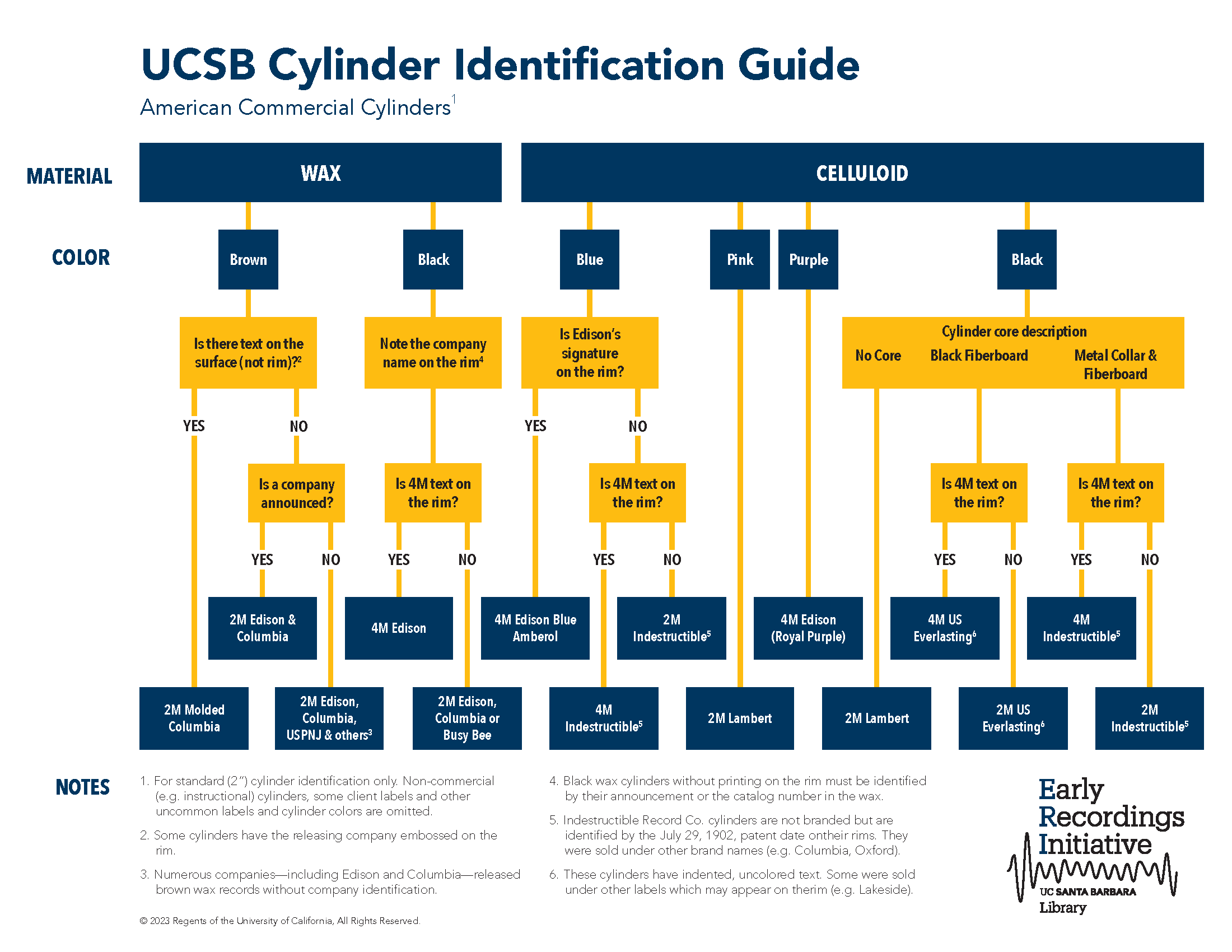They key to the correct cataloging and playback of commercially recorded cylinders begins with the identification of their make and manufacturer. UCSB's ERI has created this free identification guide to help.